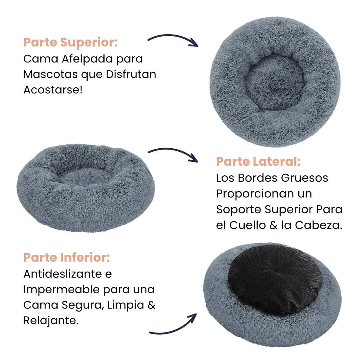 Cada detalle de nuestra cama está pensado para el confort total de tu mascota: felpa ultra suave, bordes de soporte y base antideslizante que garantizan una experiencia de descanso segura, cómoda y duradera.
